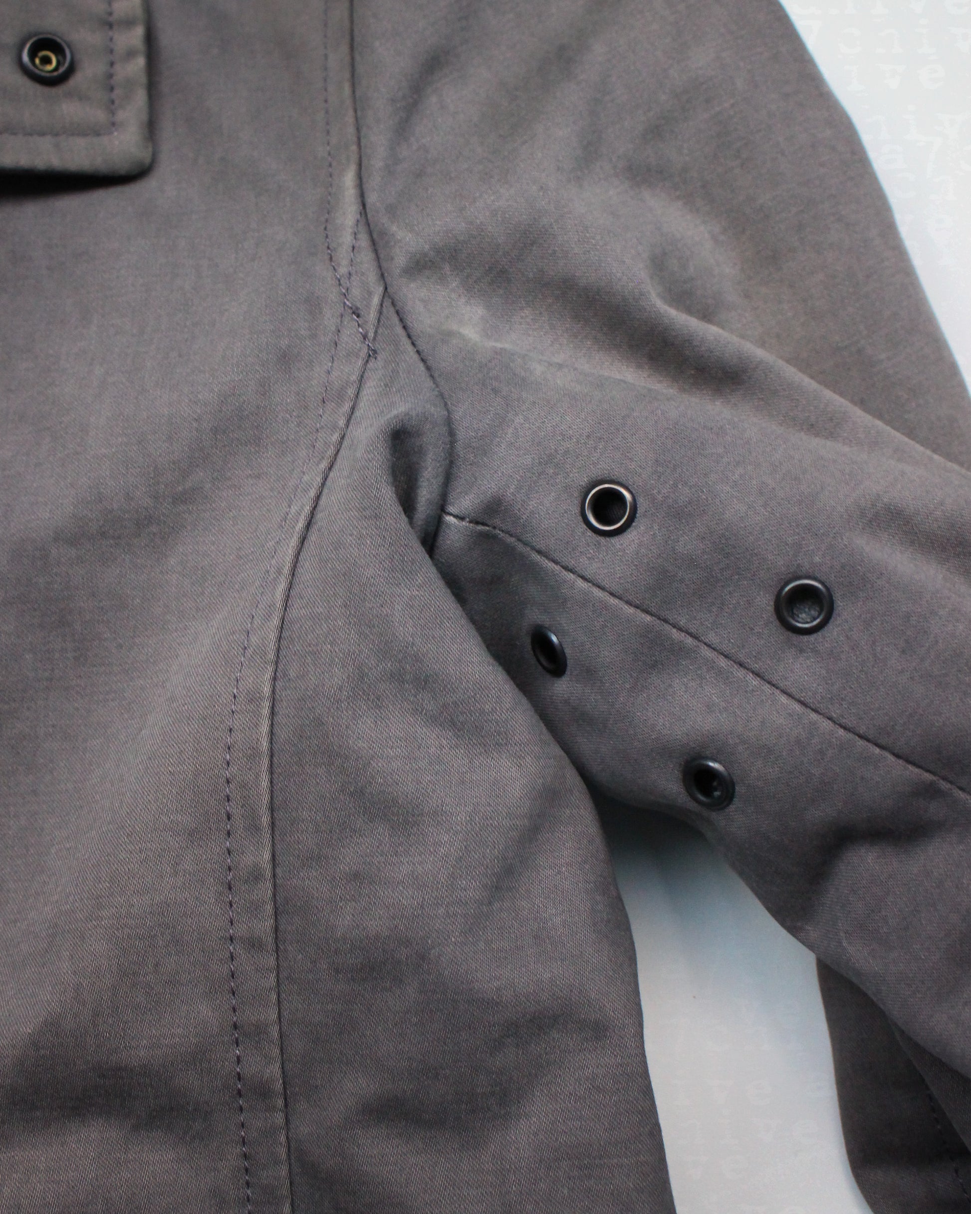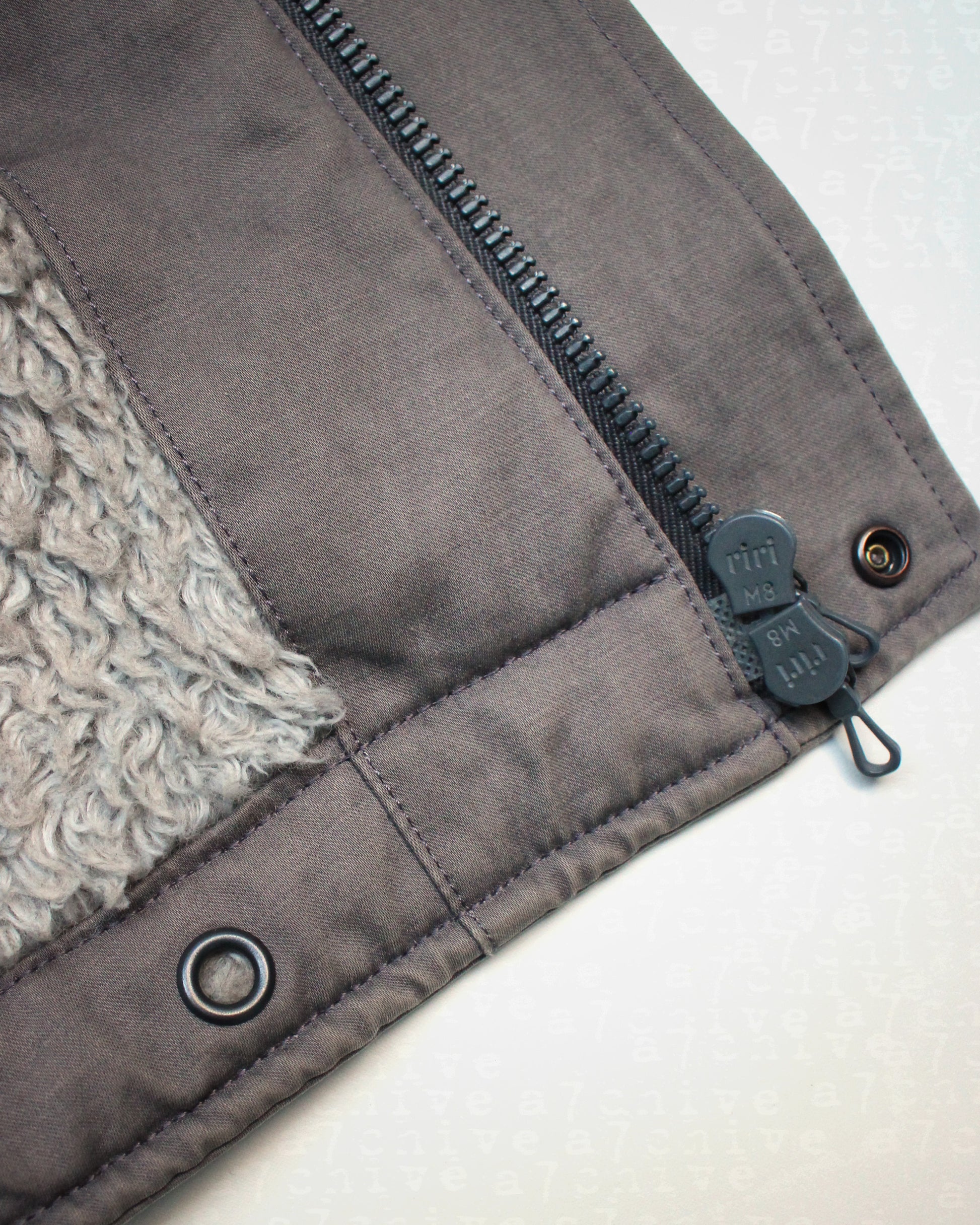 Composed of a cotton shell and sherpa wool body lining that extends to the collar, this subdued grey jacket from ATTACHMENT is a testament to the brand’s high quality construction and minimalist aesthetic. The collar can be worn up or down, secured with either the zip or snap-buttons. The front closure includes a double riri zipper covered by a snap-button storm flap, providing extra protection from the elements. The sleeves have a curved cut with zippered cuffs for wide + snug fit options. Inside the sleeves is a soft cupra lining, and an elasticated cuff within the shell, keeping the wrists warm. A great jacket for the season, very warm while retaining a sleek look.