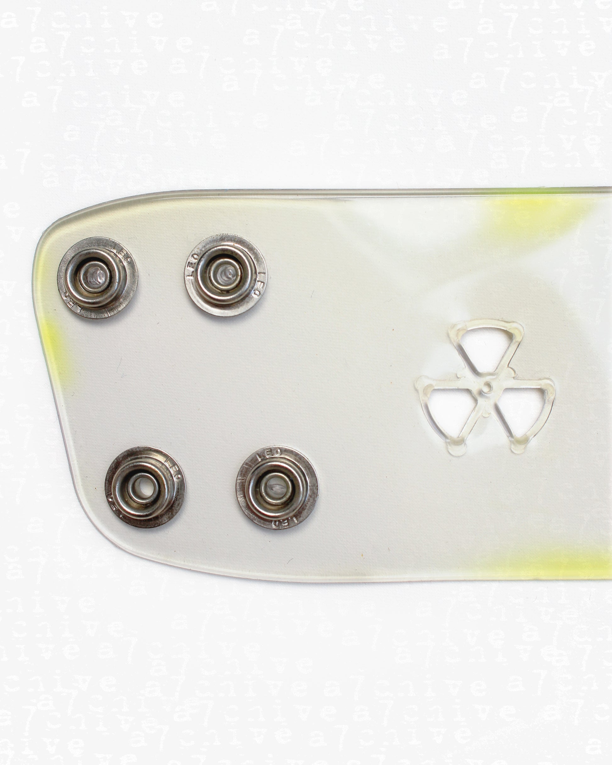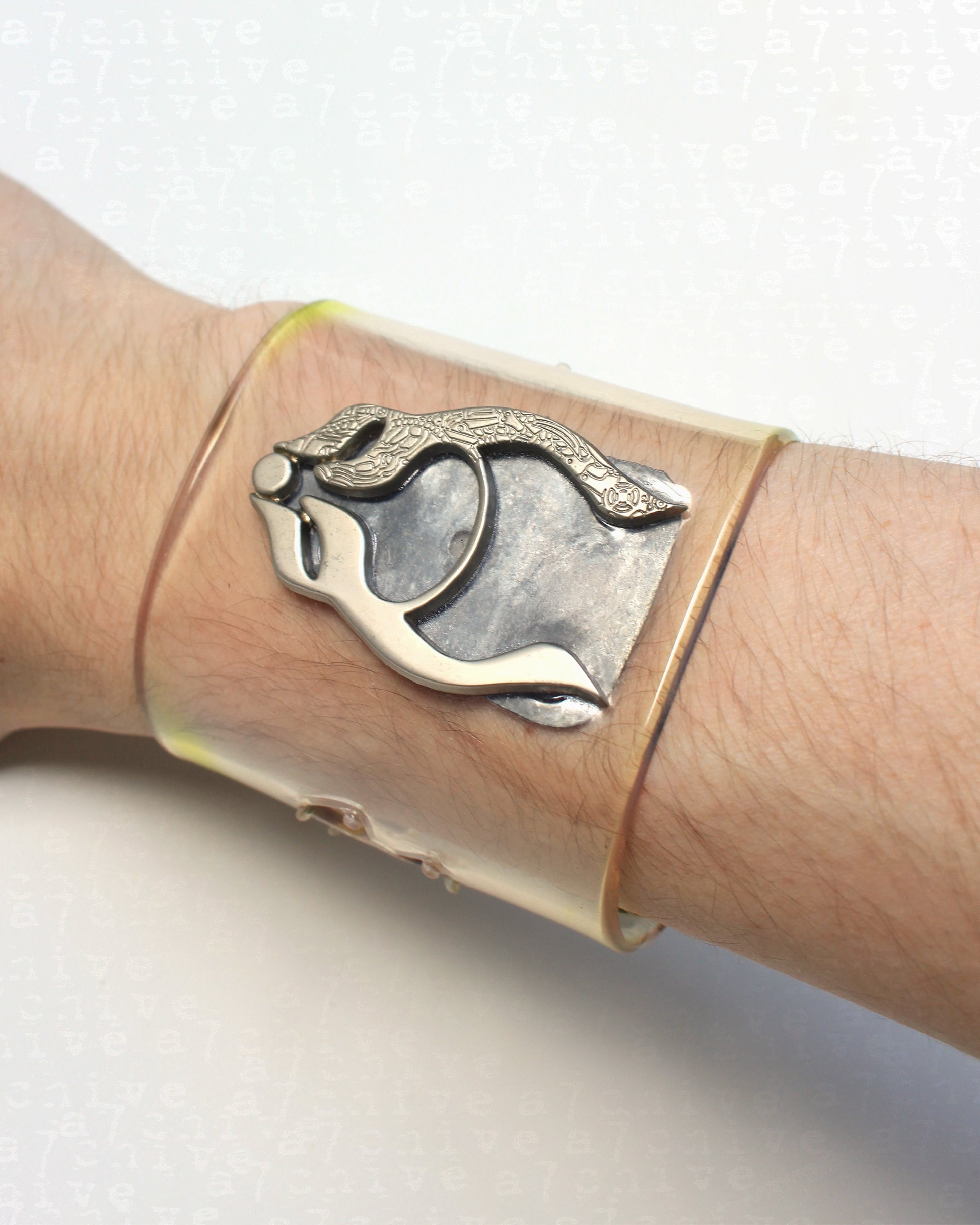 This particular bracelet features a transparent base with a metal Cyberdog emblem and toxic/radioactive symbol cutouts. Years of raving have left a hangover of neon yellow tints on the base.