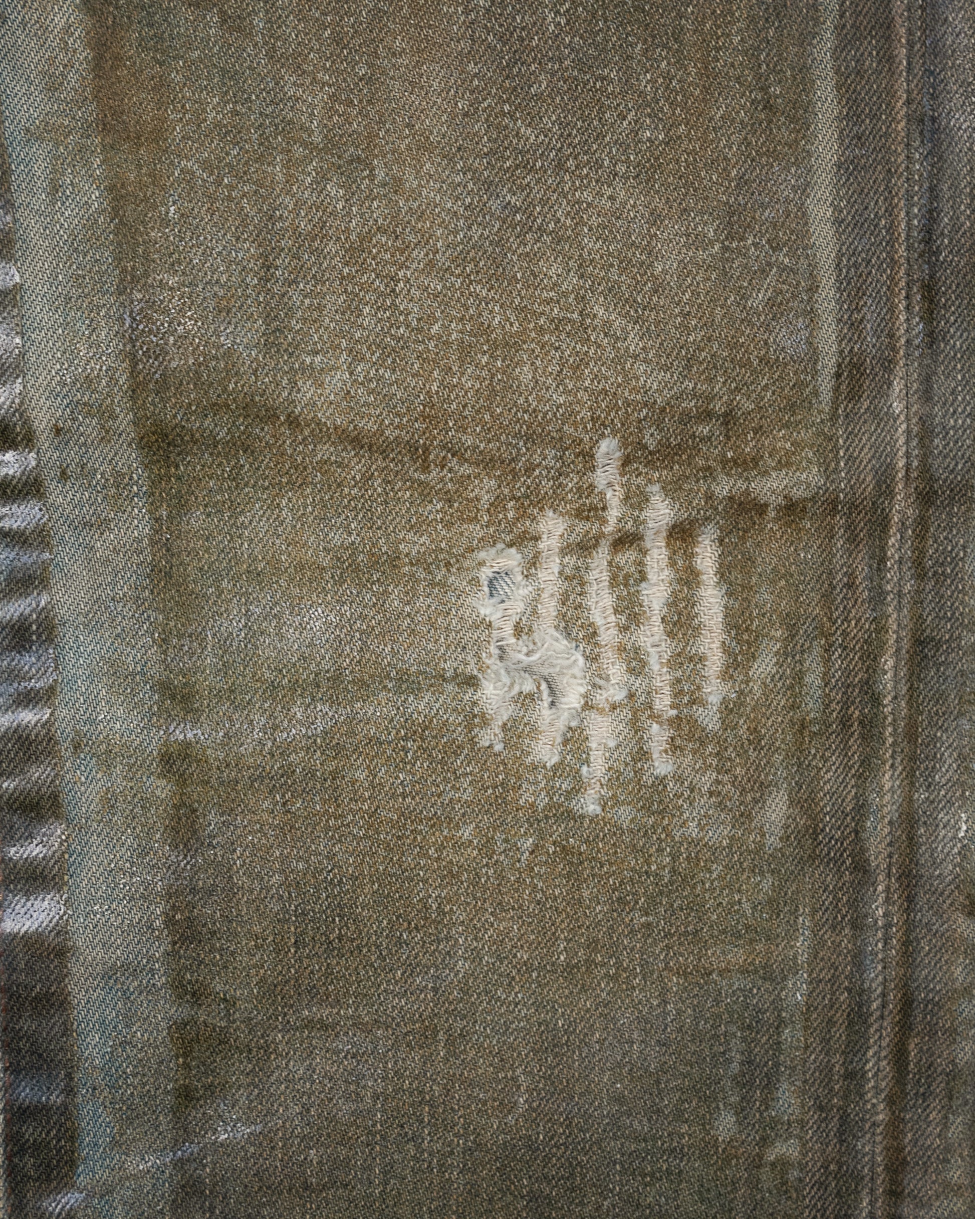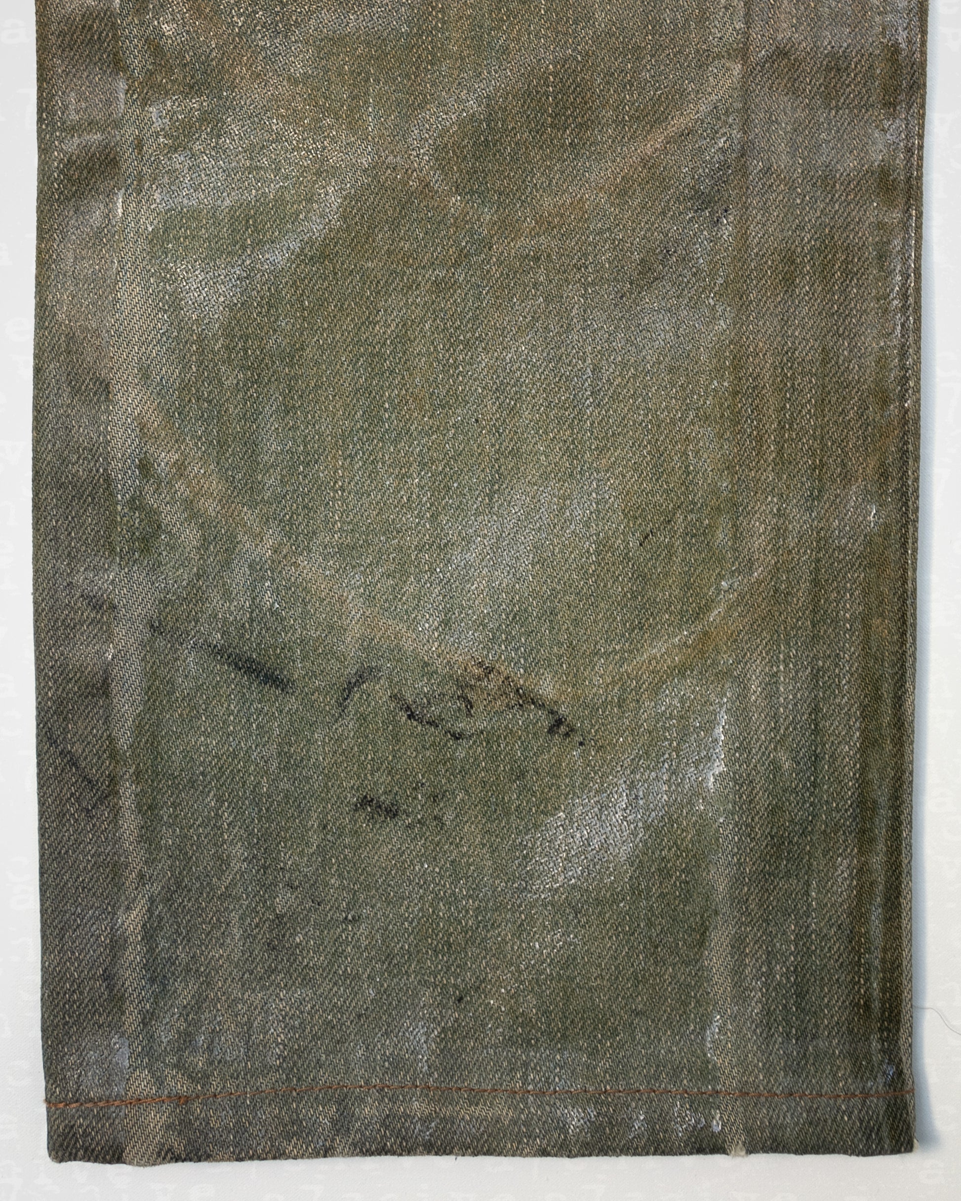 These light blue jeans worn on the runway feature a wax coating and the iconic clawmark distressing on the left knee. This pair has been altered at the waistband and hemmed to fit closer to a size 26. In used condition with rips highlighted in the images that have been repaired, and some marks on the back on the leg.
