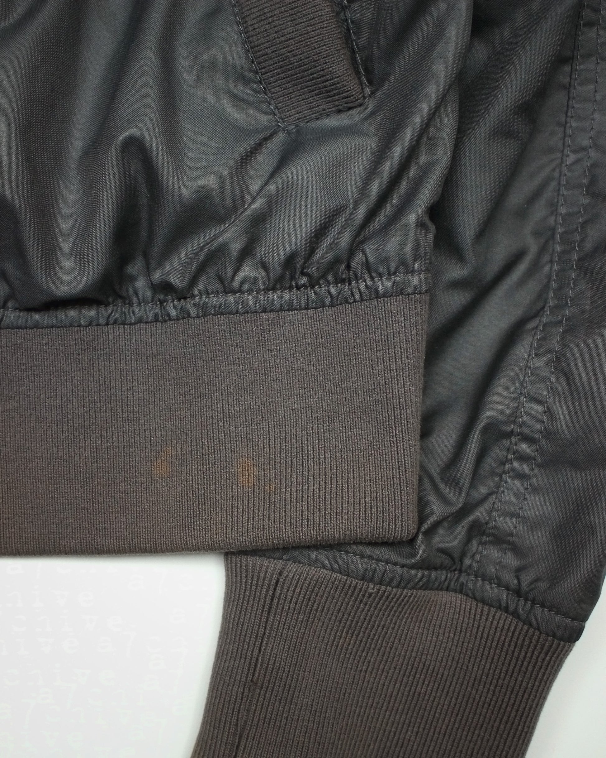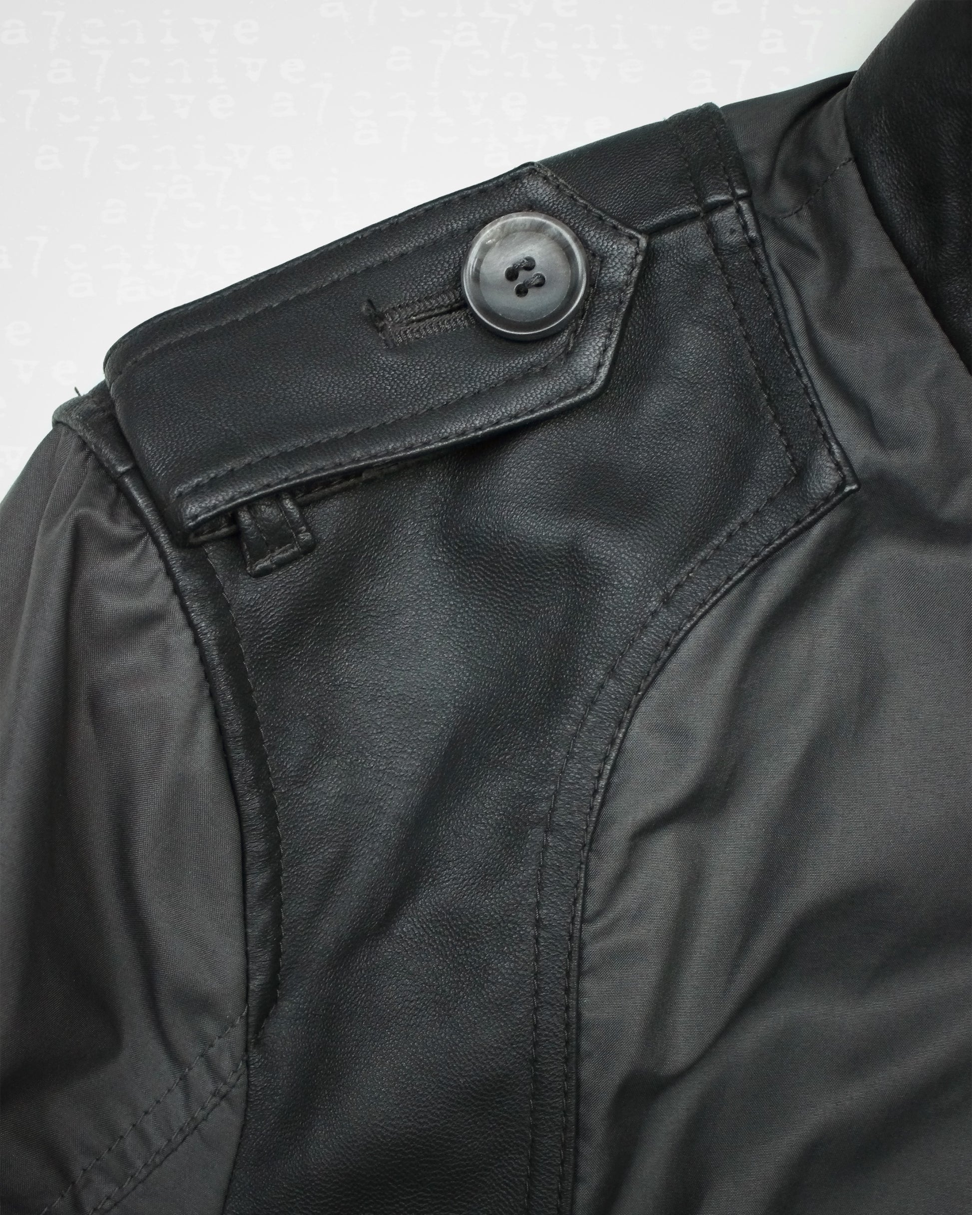 This jacket is designed with a high-contrast texture play, pairing smooth nylon across the body with supple leather accents on the shoulders and sleeve seams. Key details include buttoned shoulder epaulets, a ribbed collar with an integrated zip-up mock neck layer, and ribbed knit cuffs and hem for a tailored fit. Functional elements include two front pockets and a small welt chest pocket for added utility.