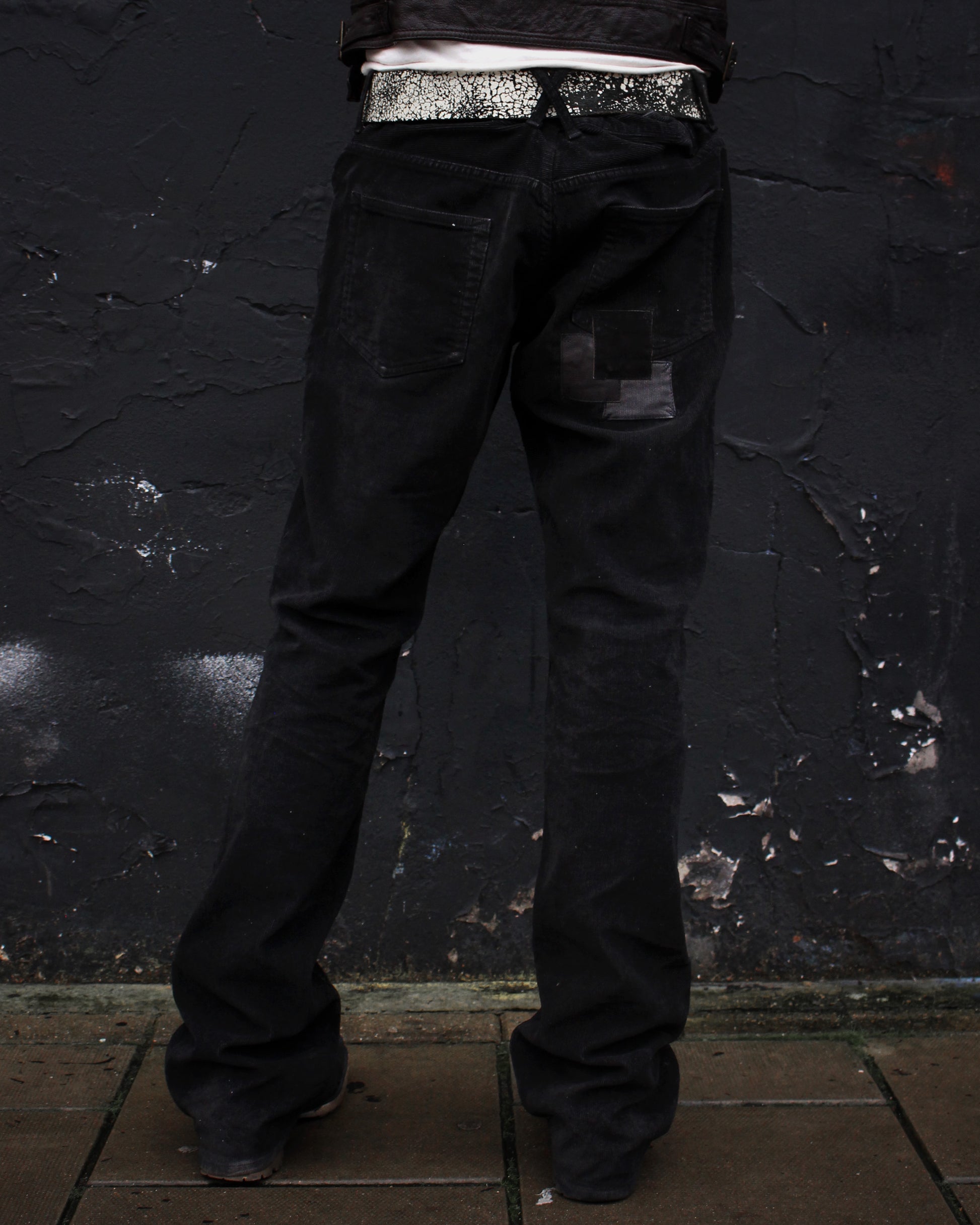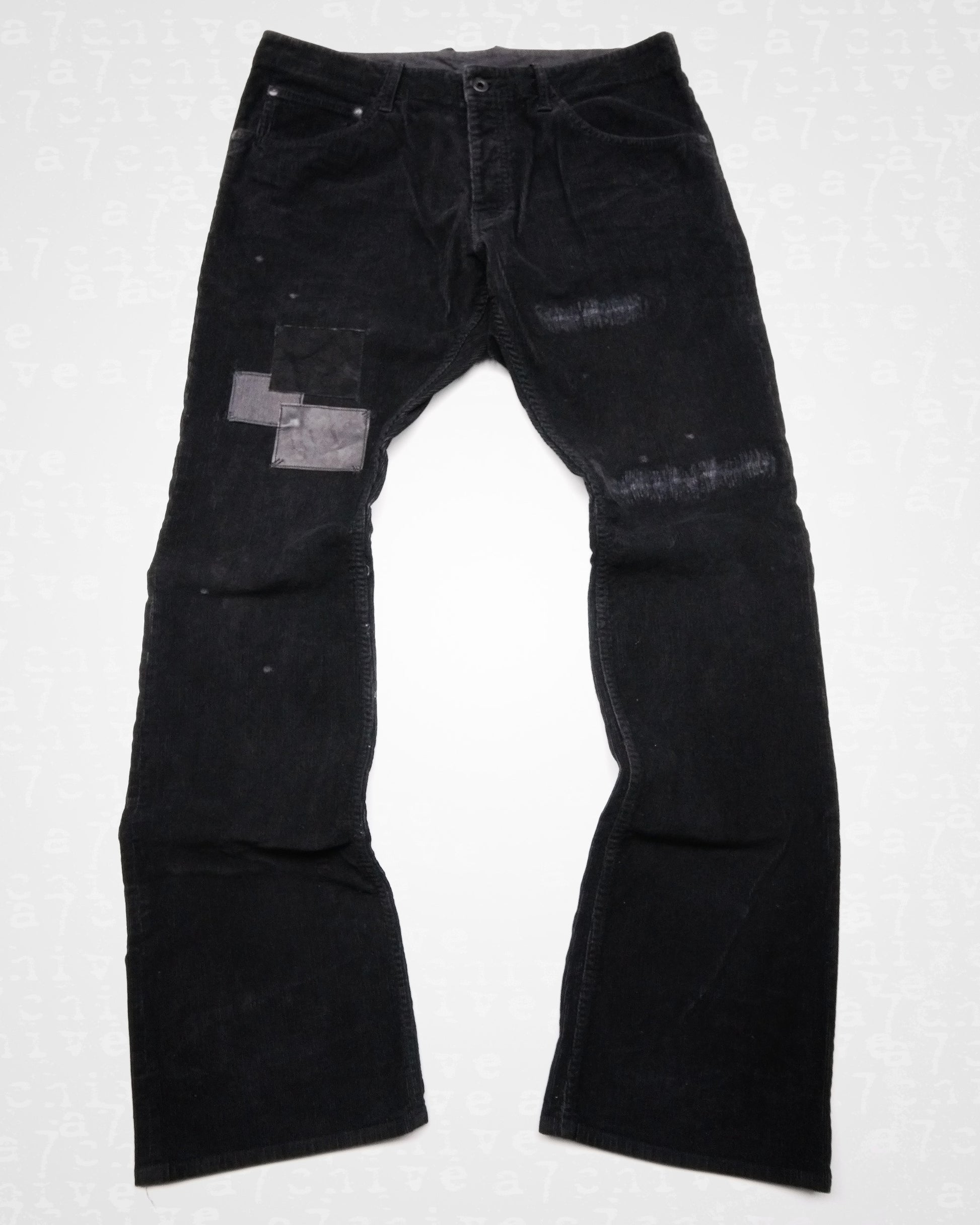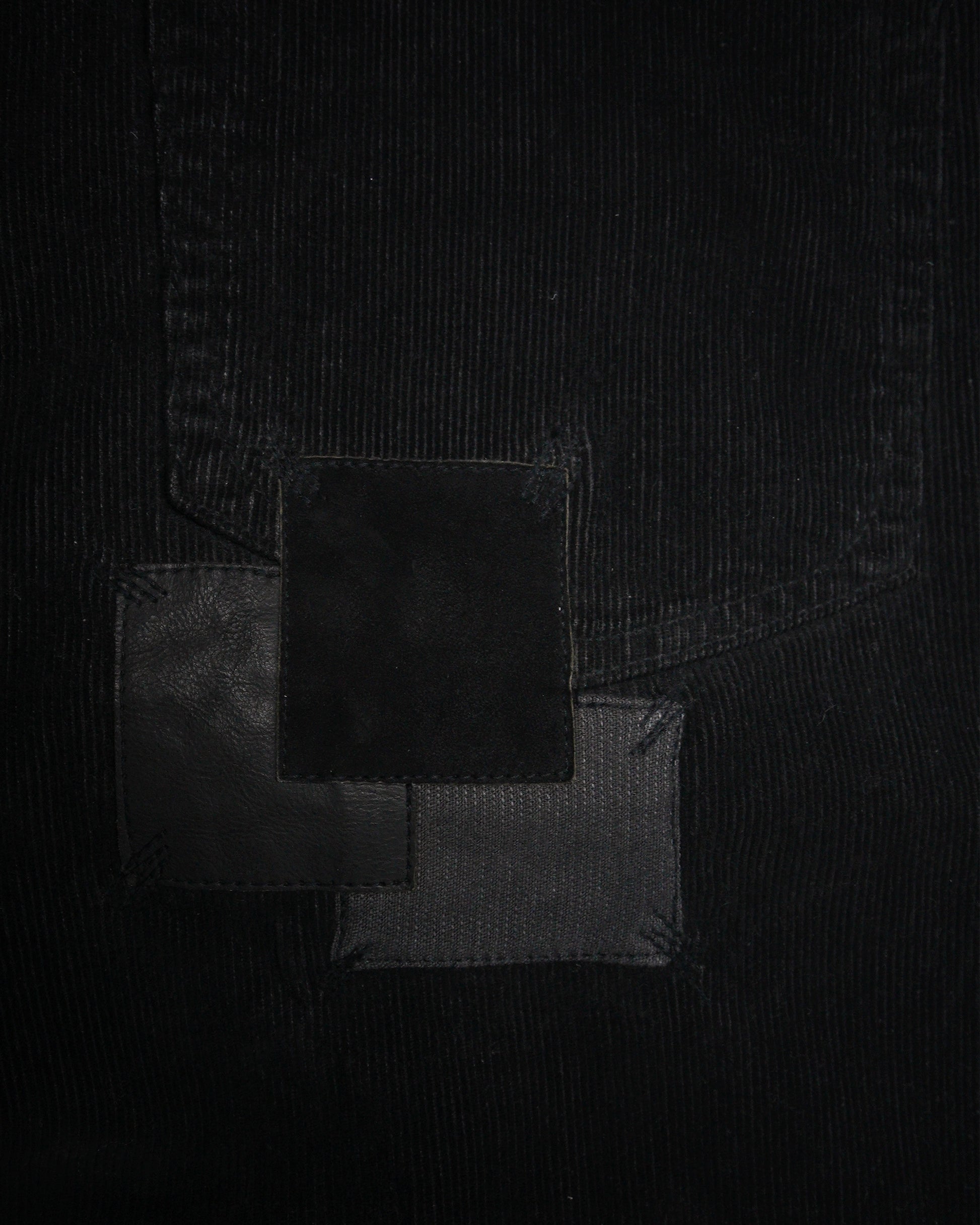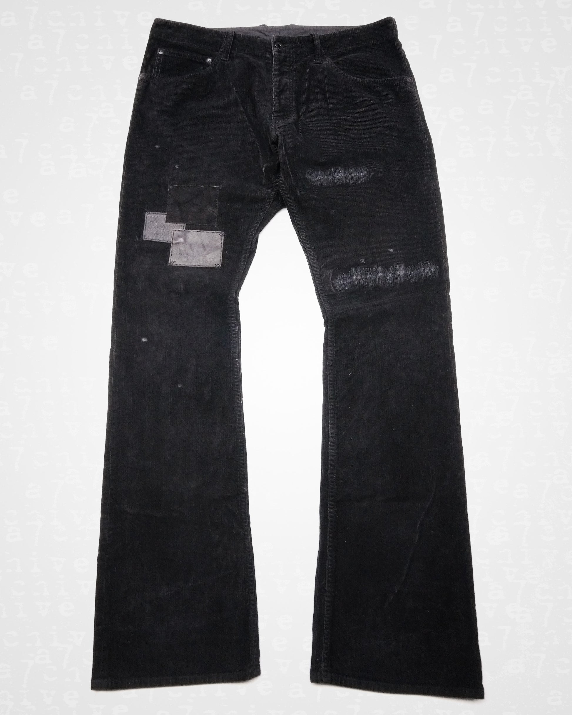These bootcut trousers made in a stretch corduroy feature sewn repairs and patchwork with reverse corduroy, calf leather and suede.