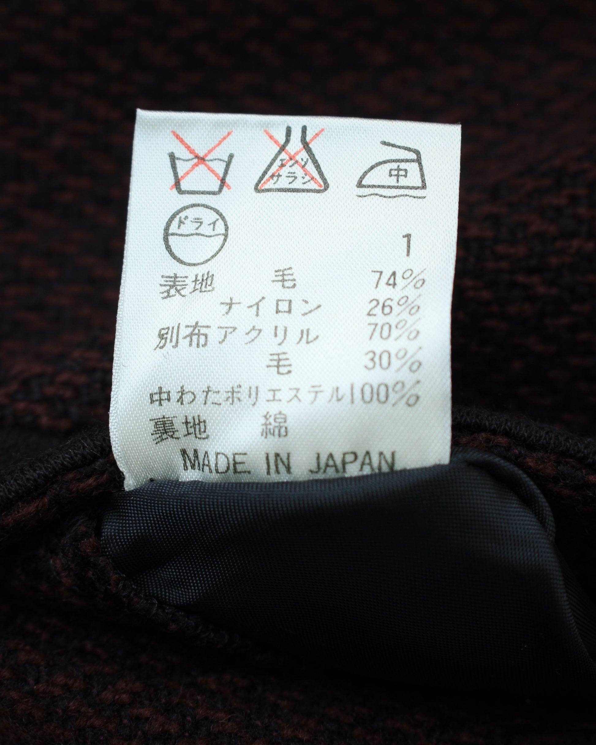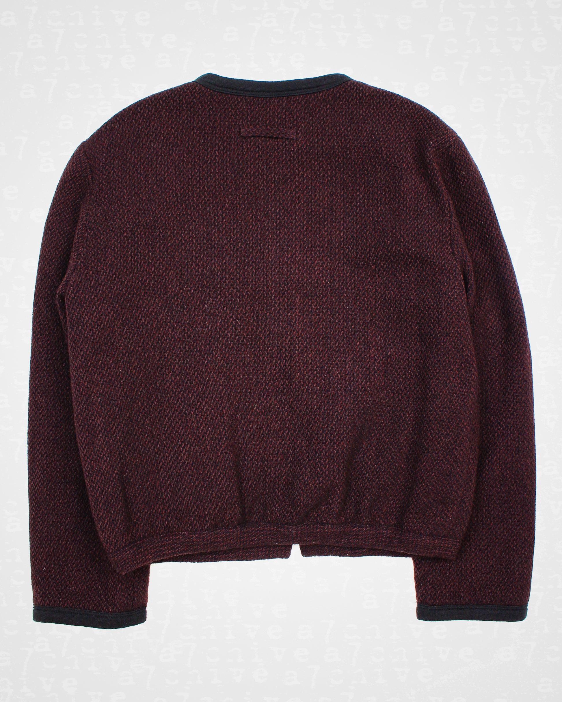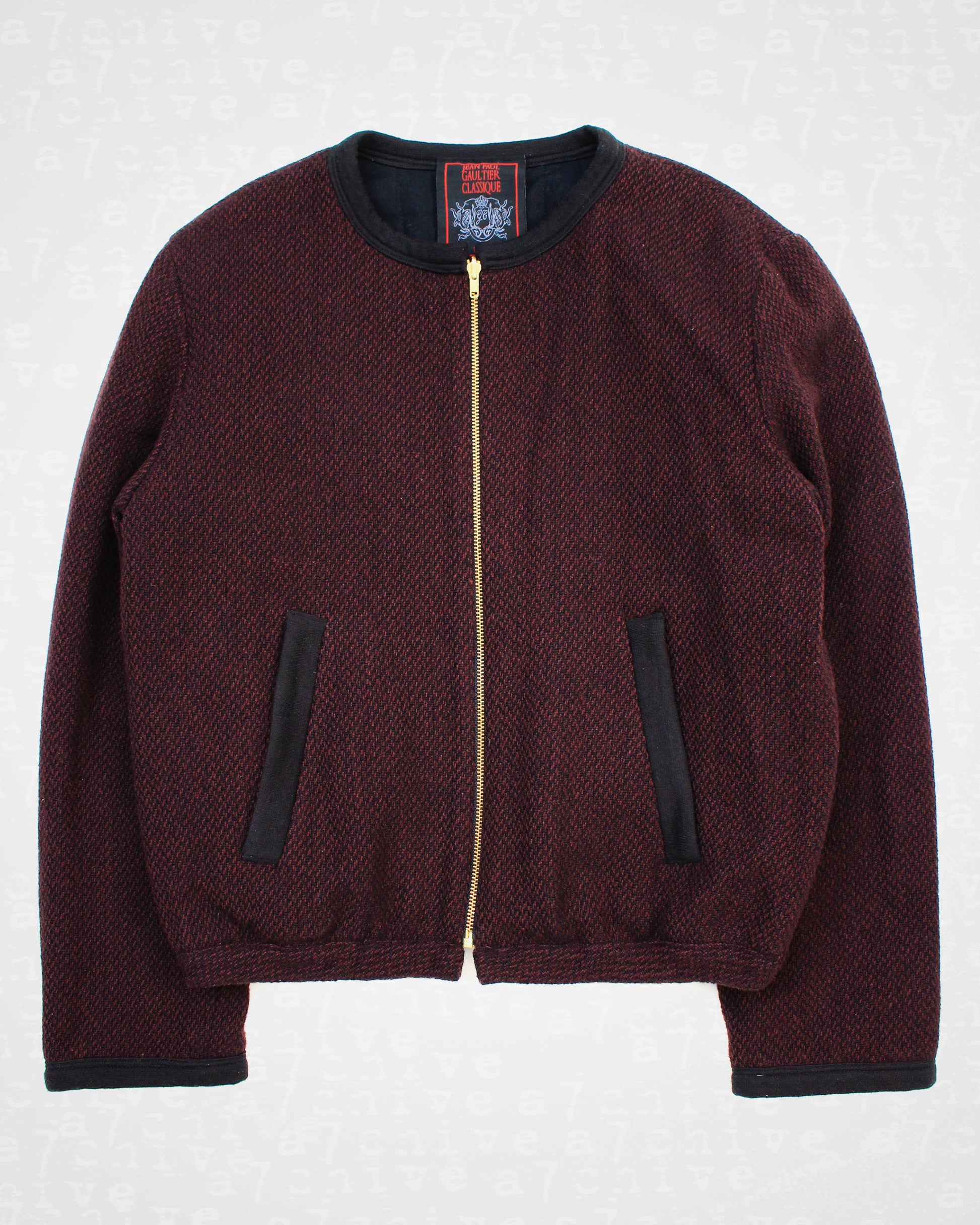 This jacket features a wool body with a deep burgundy pattern and a gold-tone front zipper. The collarless neckline, pocket trim, and cuffs are finished with black edging. The cut is relaxed with slight gathers at the hem, giving it a slightly boxy 80s silhouette.