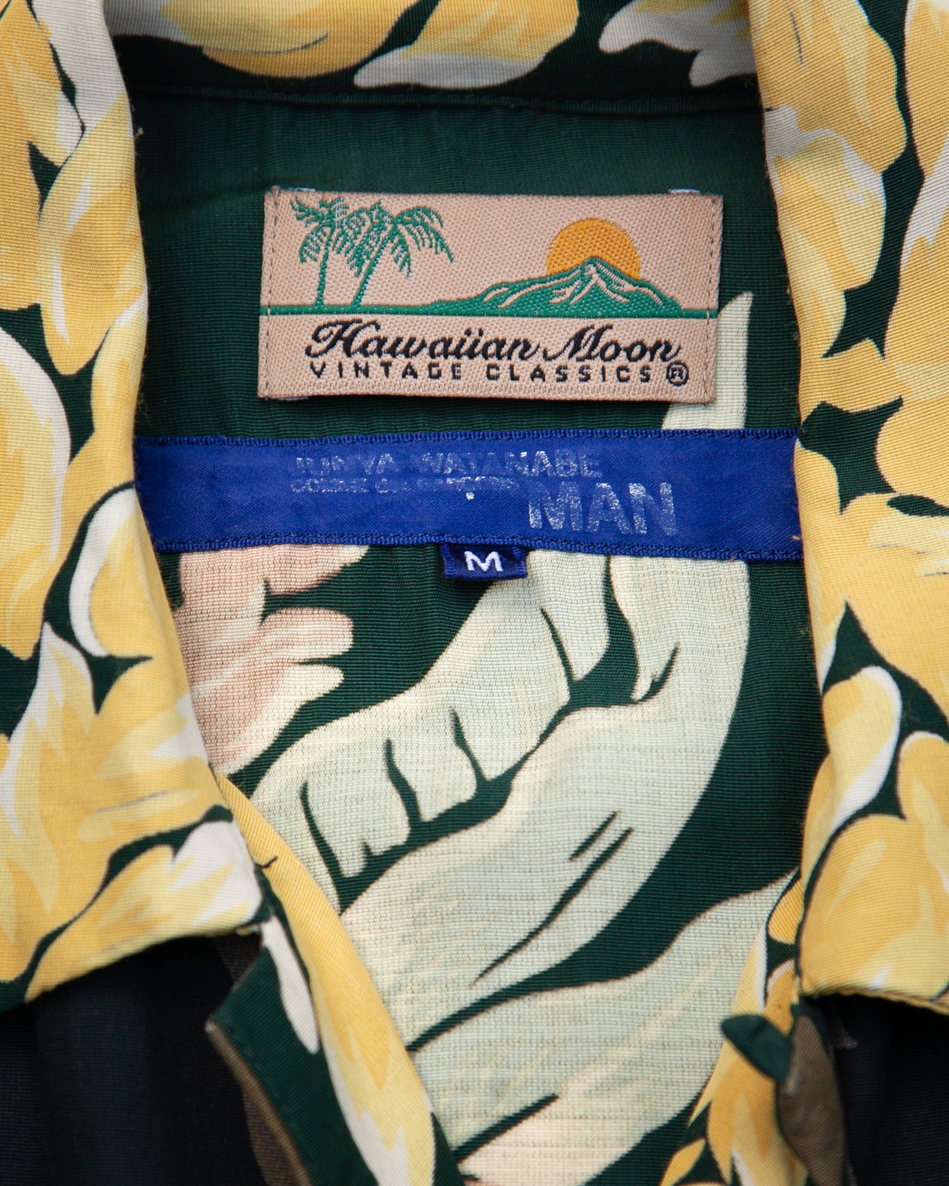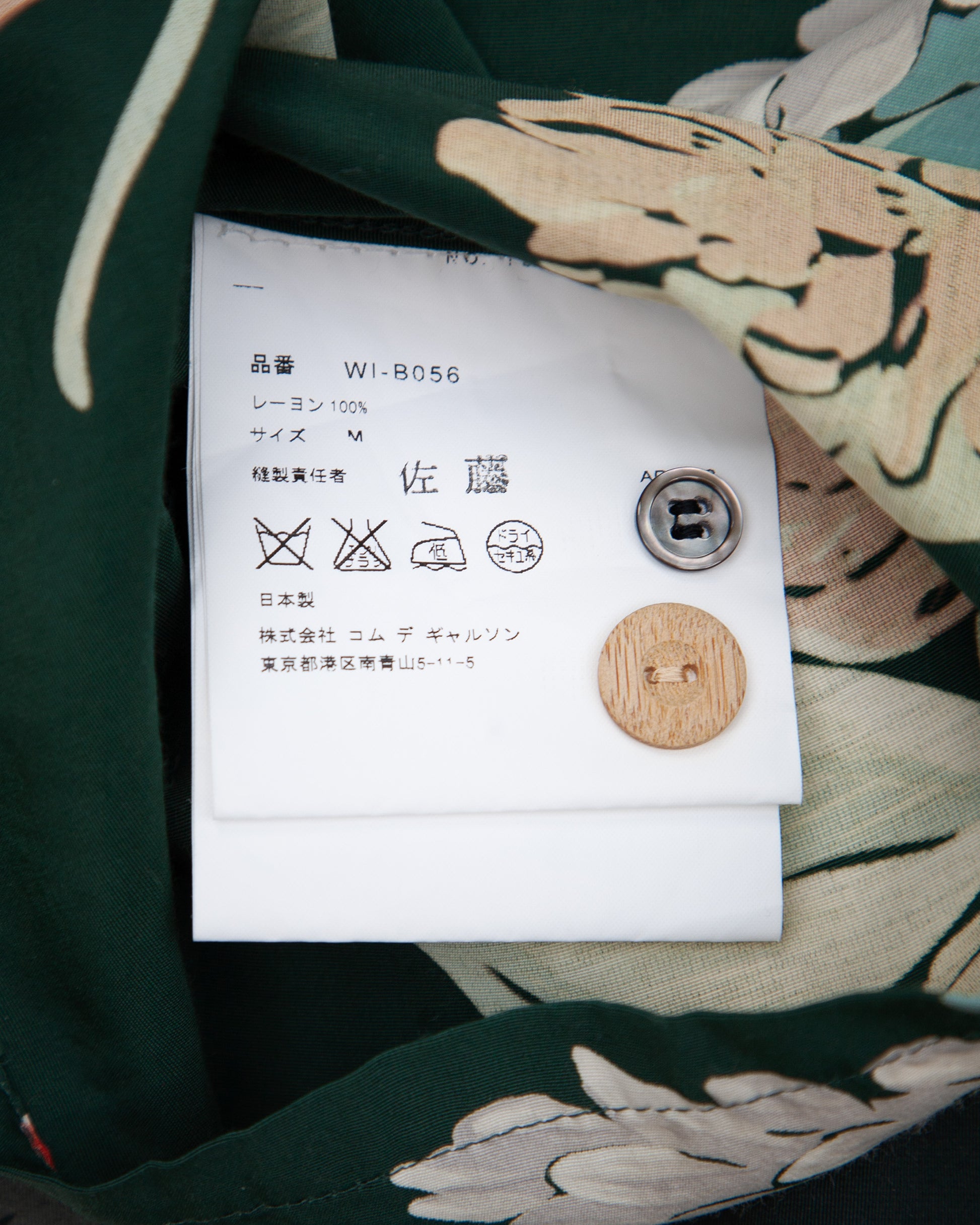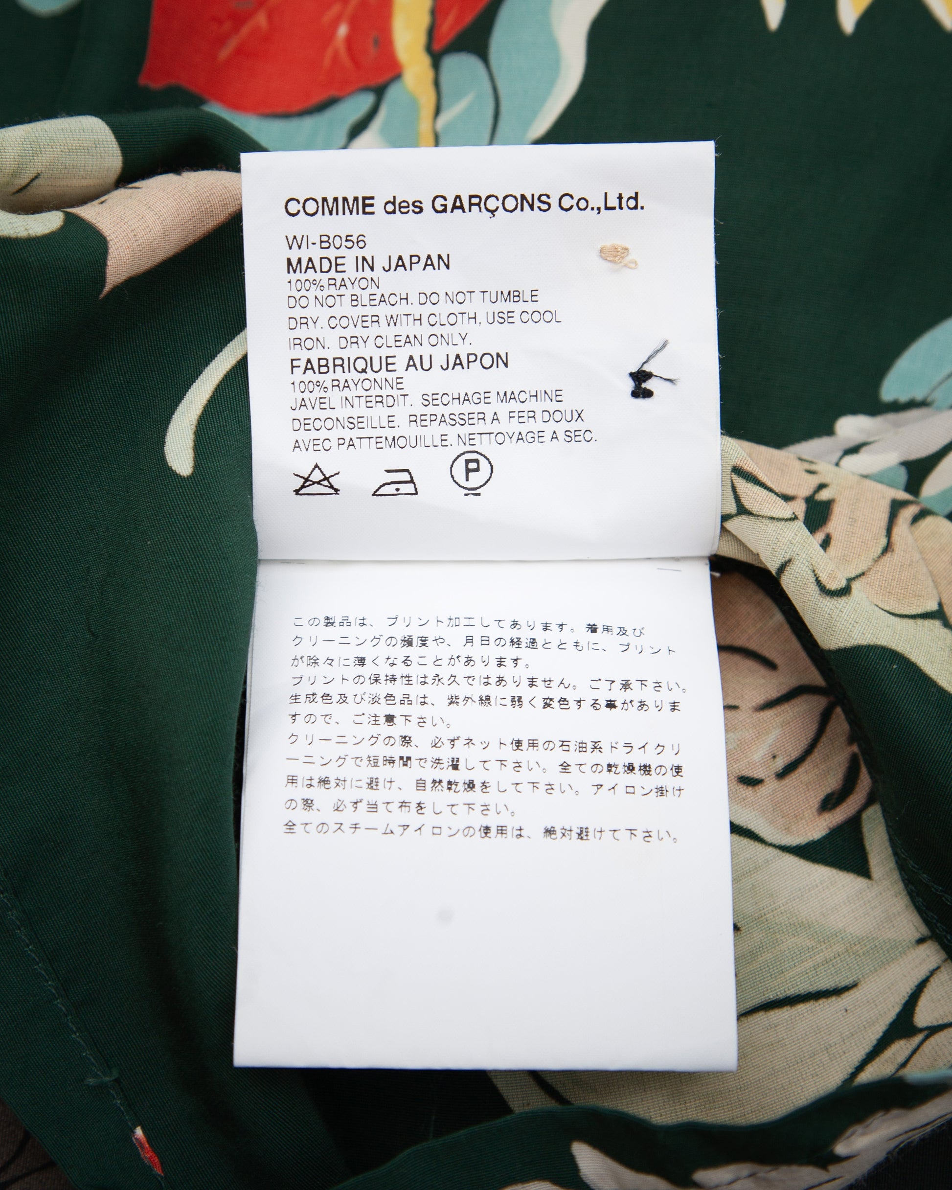 Featured on the runway of his 2003 Spring / Summer season, Watanabe recontextualised hawaiian shirts, with various floral prints shown on shirts and one jacket on the runway. This shirt in particular reimagines the classic Aloha shirt with a dark overprint on the front of the shirt, on a rayon body.