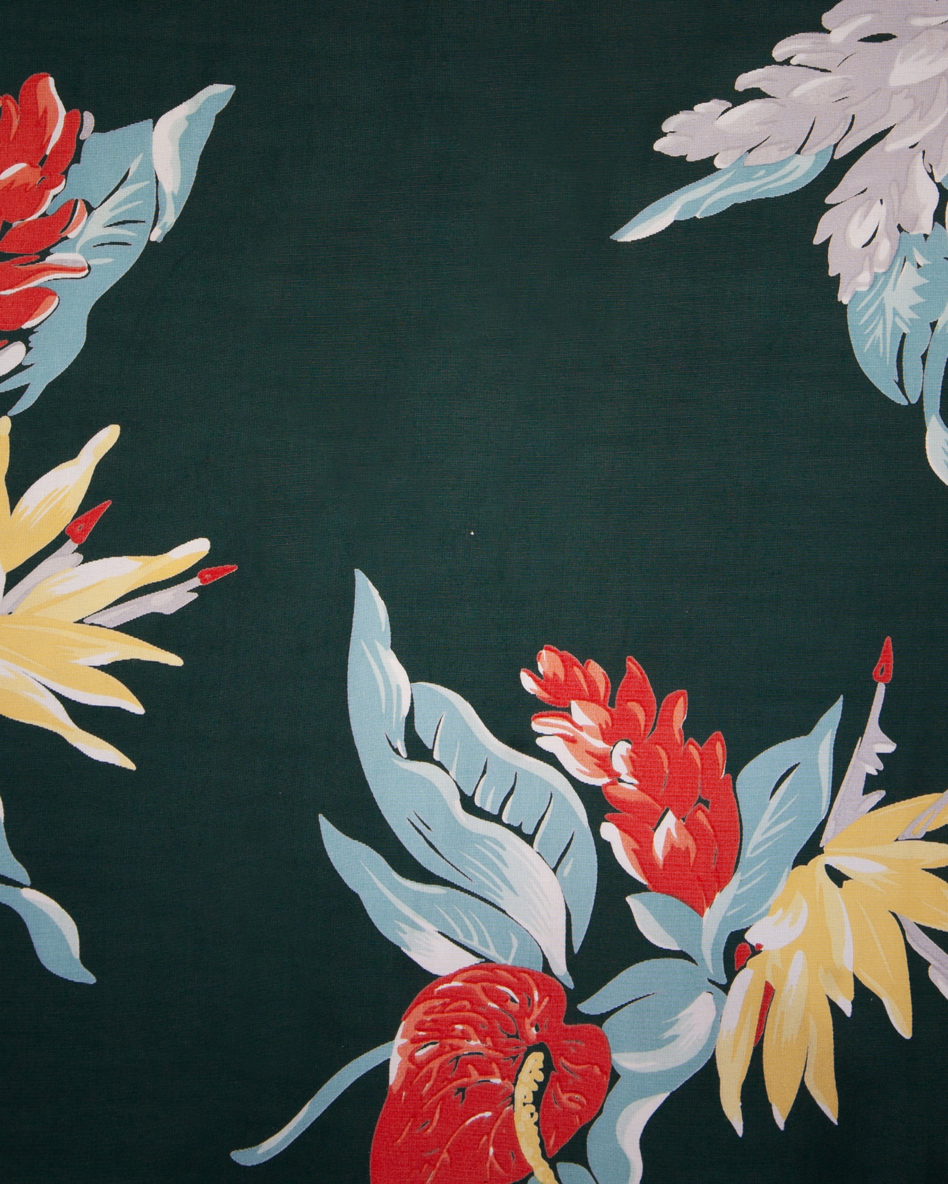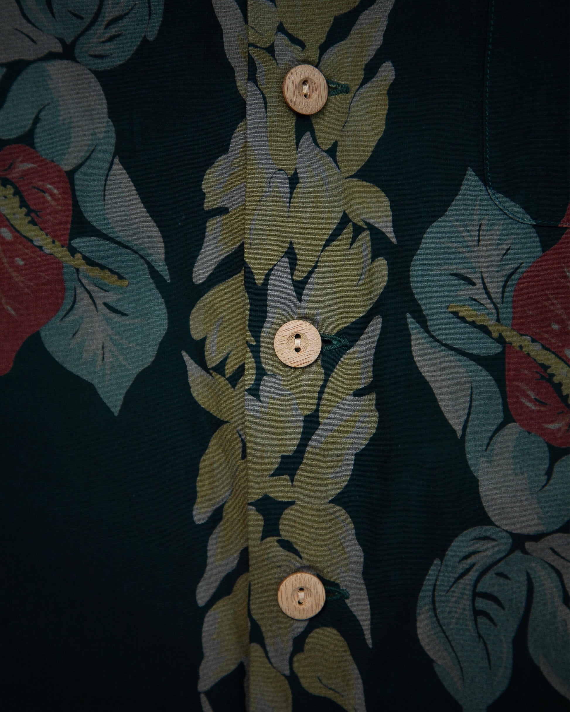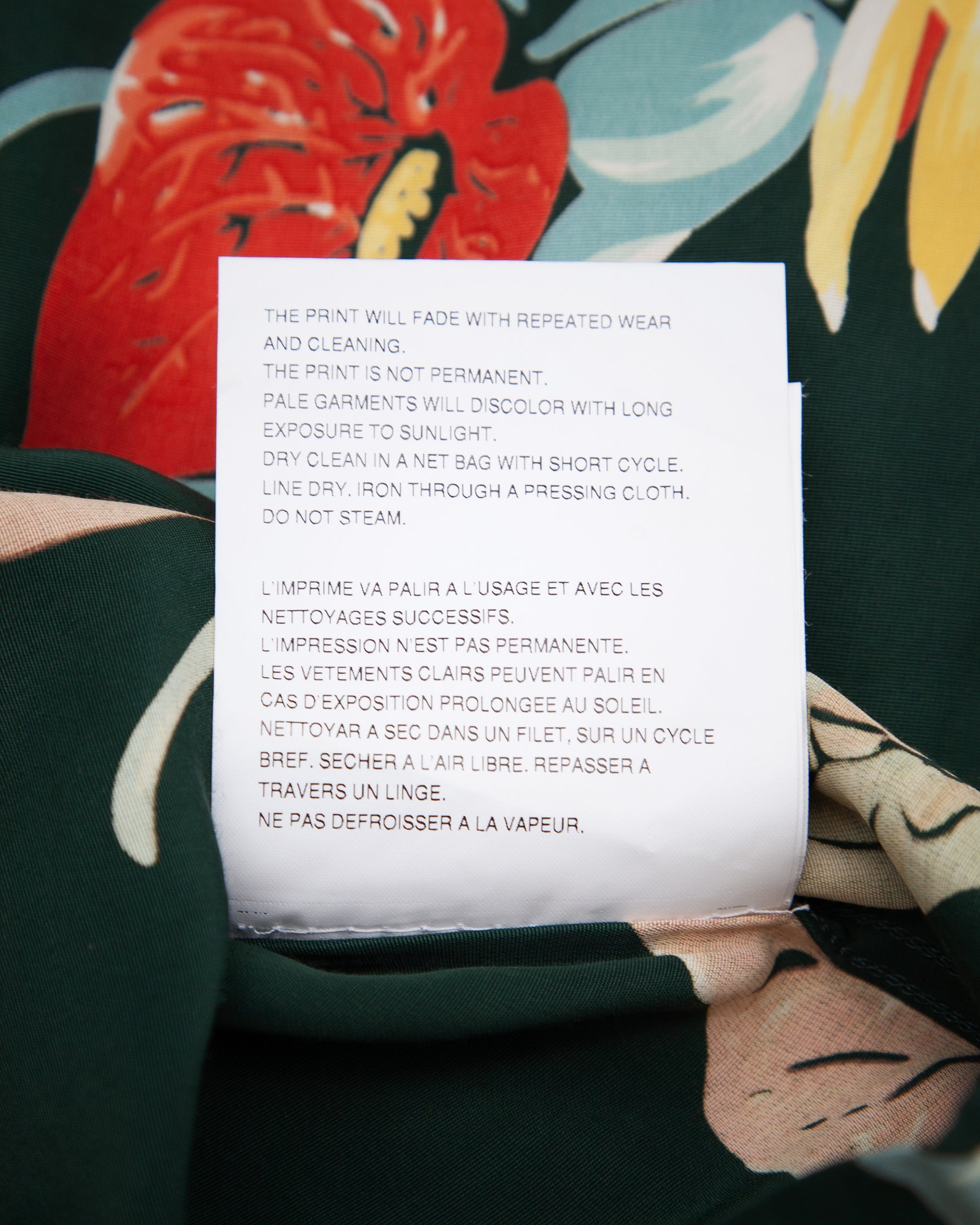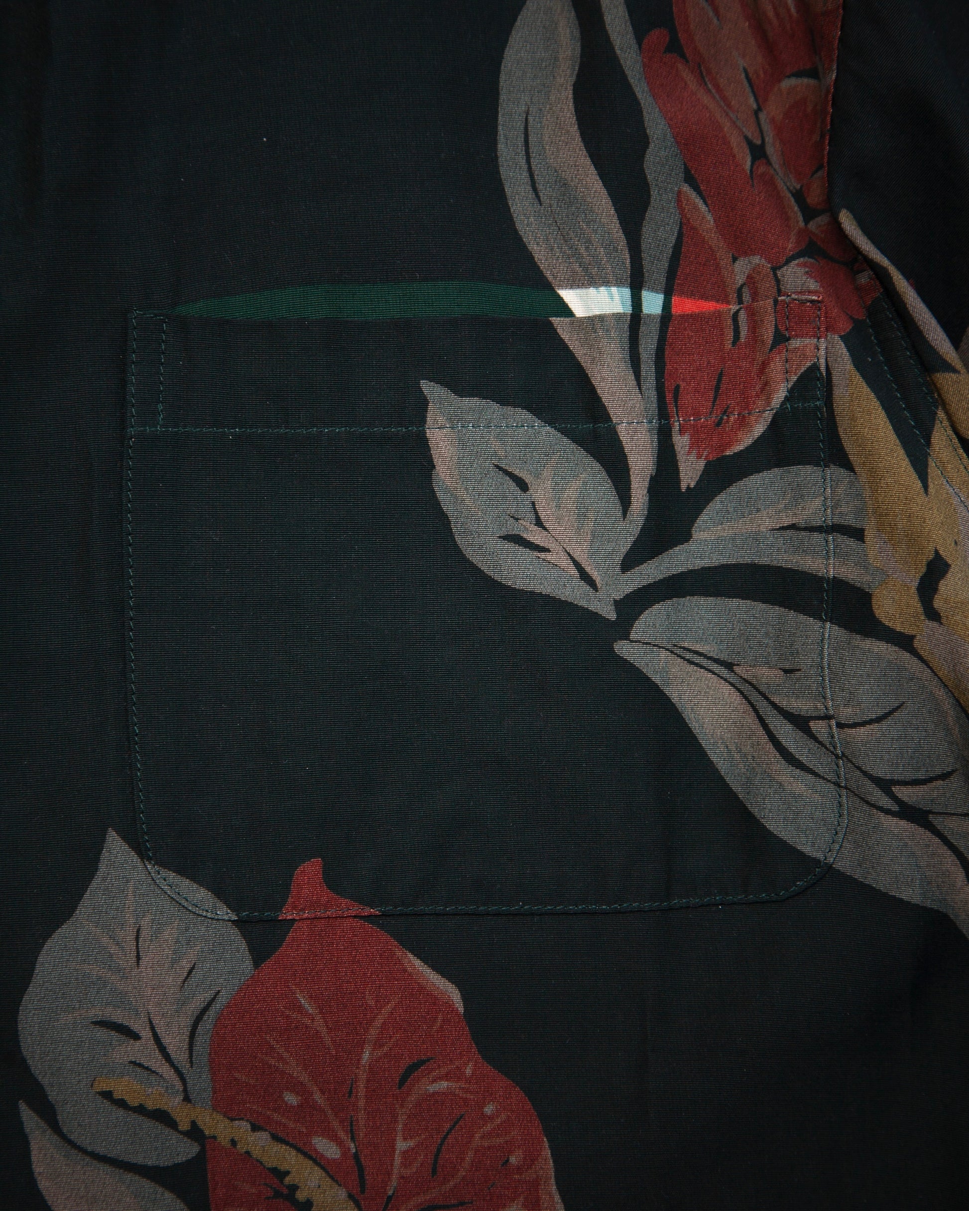 Featured on the runway of his 2003 Spring / Summer season, Watanabe recontextualised hawaiian shirts, with various floral prints shown on shirts and one jacket on the runway. This shirt in particular reimagines the classic Aloha shirt with a dark overprint on the front of the shirt, on a rayon body.