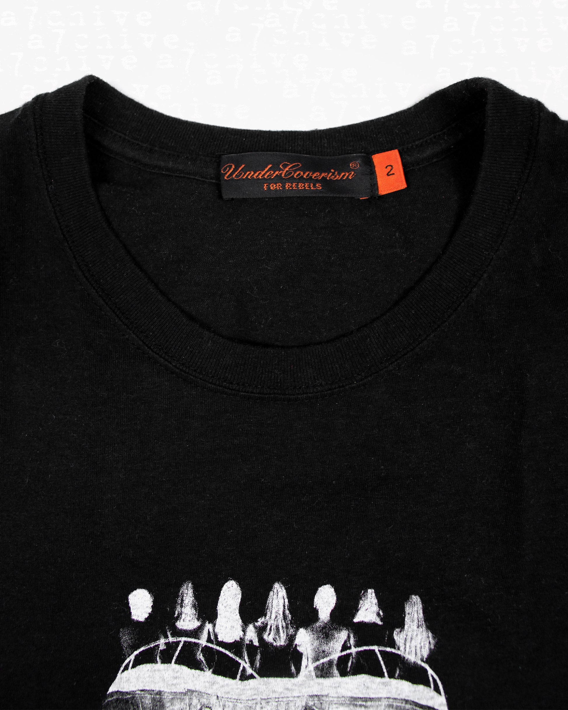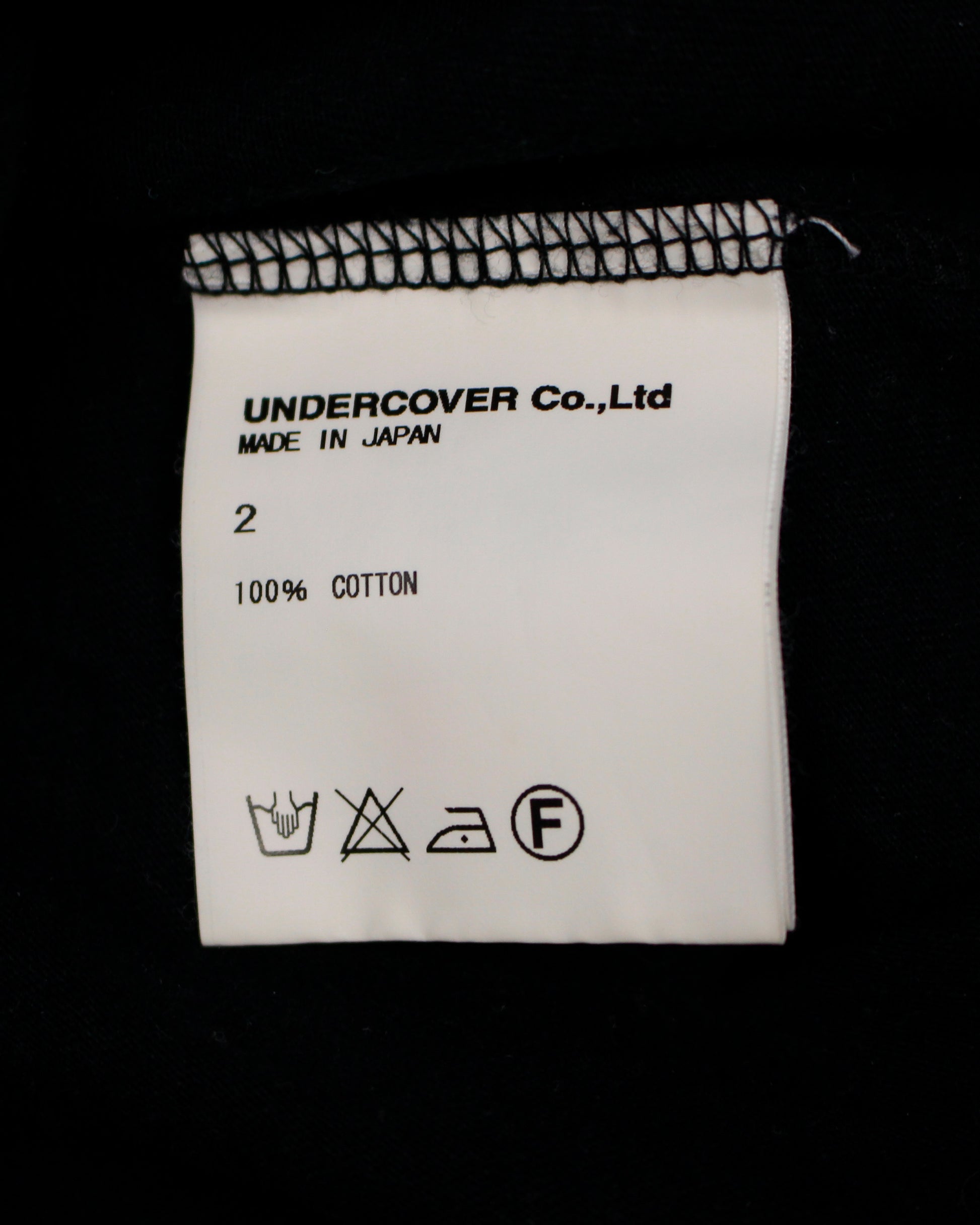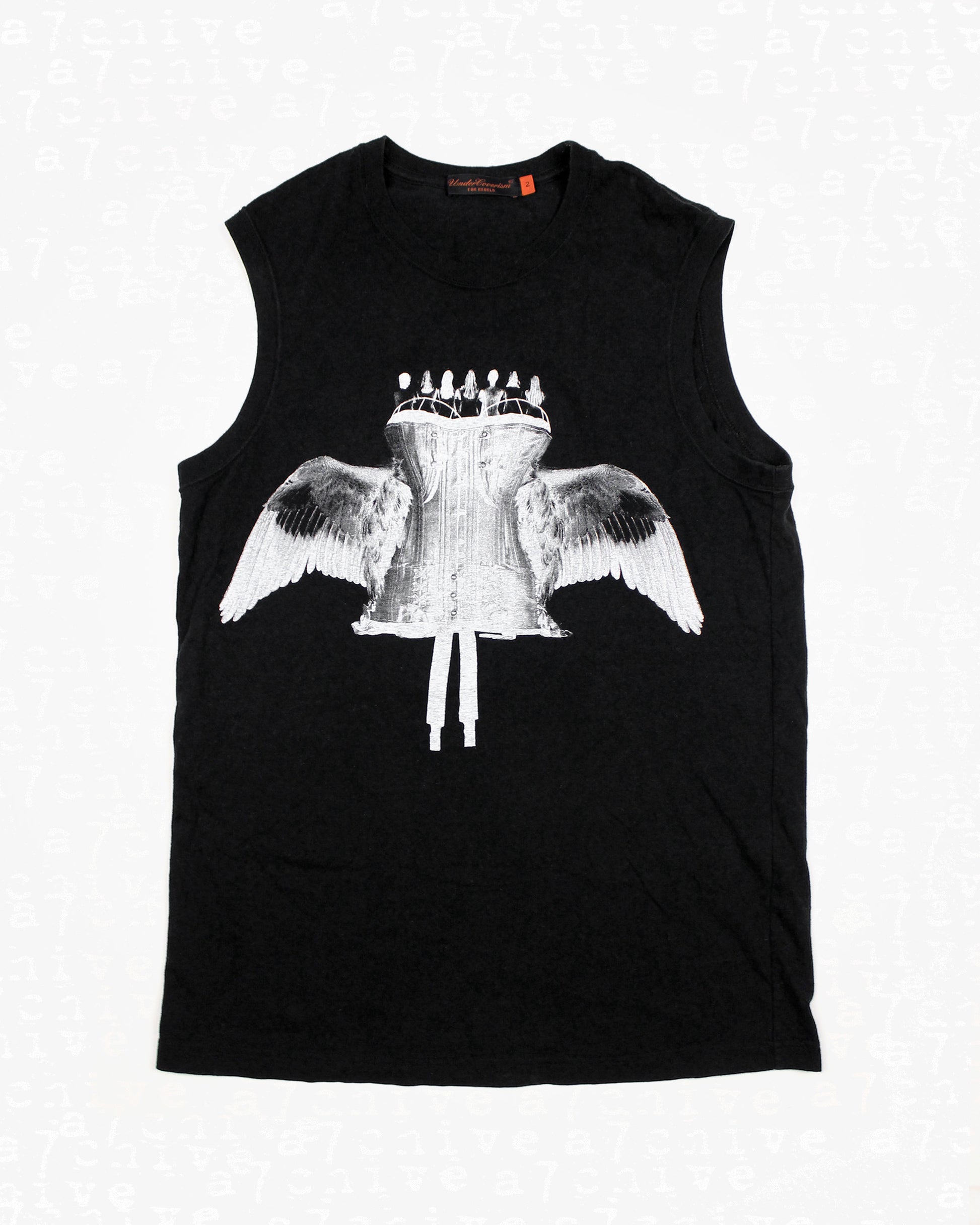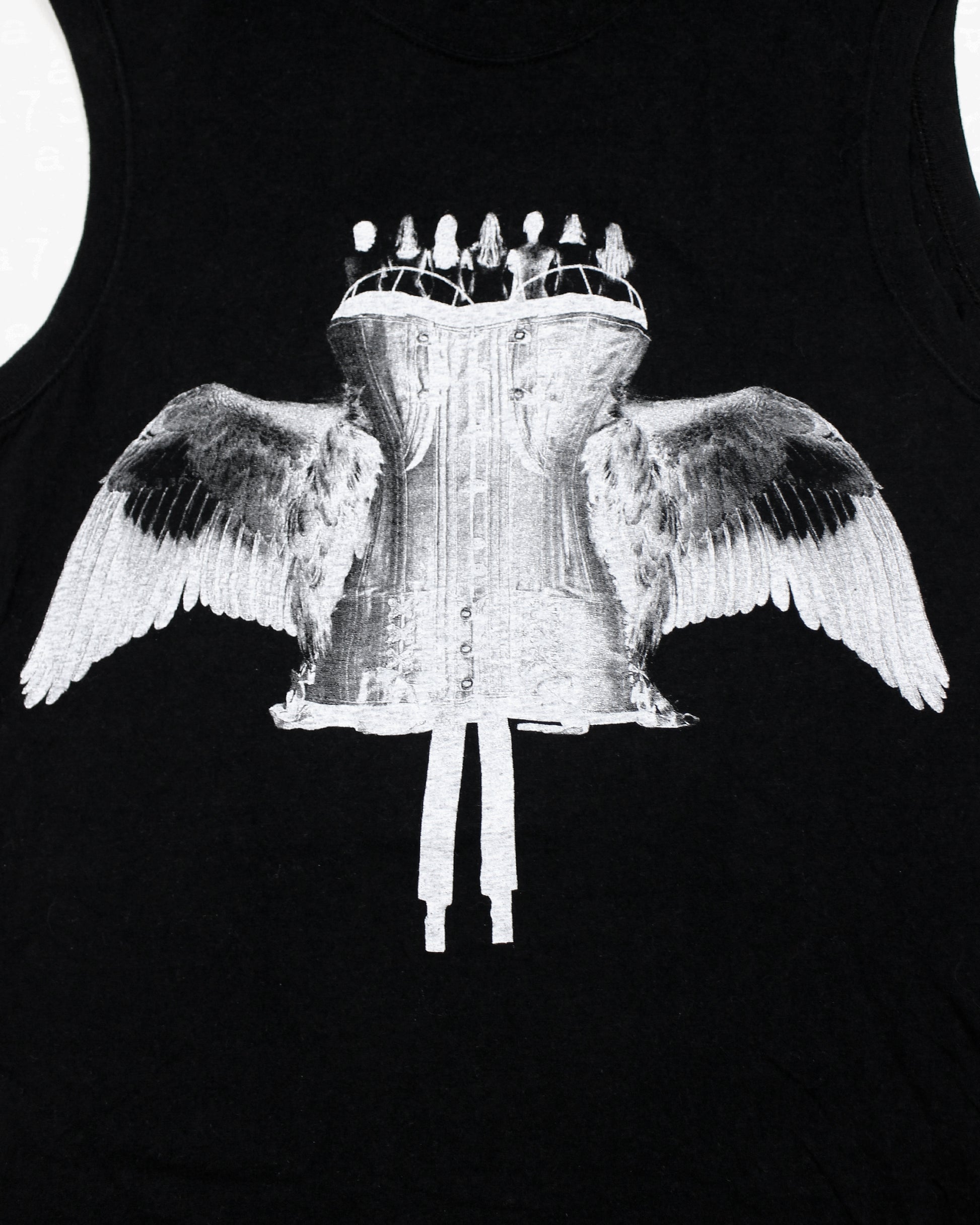 This black cotton tank top from Japanese label ‘Undercover’ by Jun Takahashi, features a negative/inverted print of a winged corset.