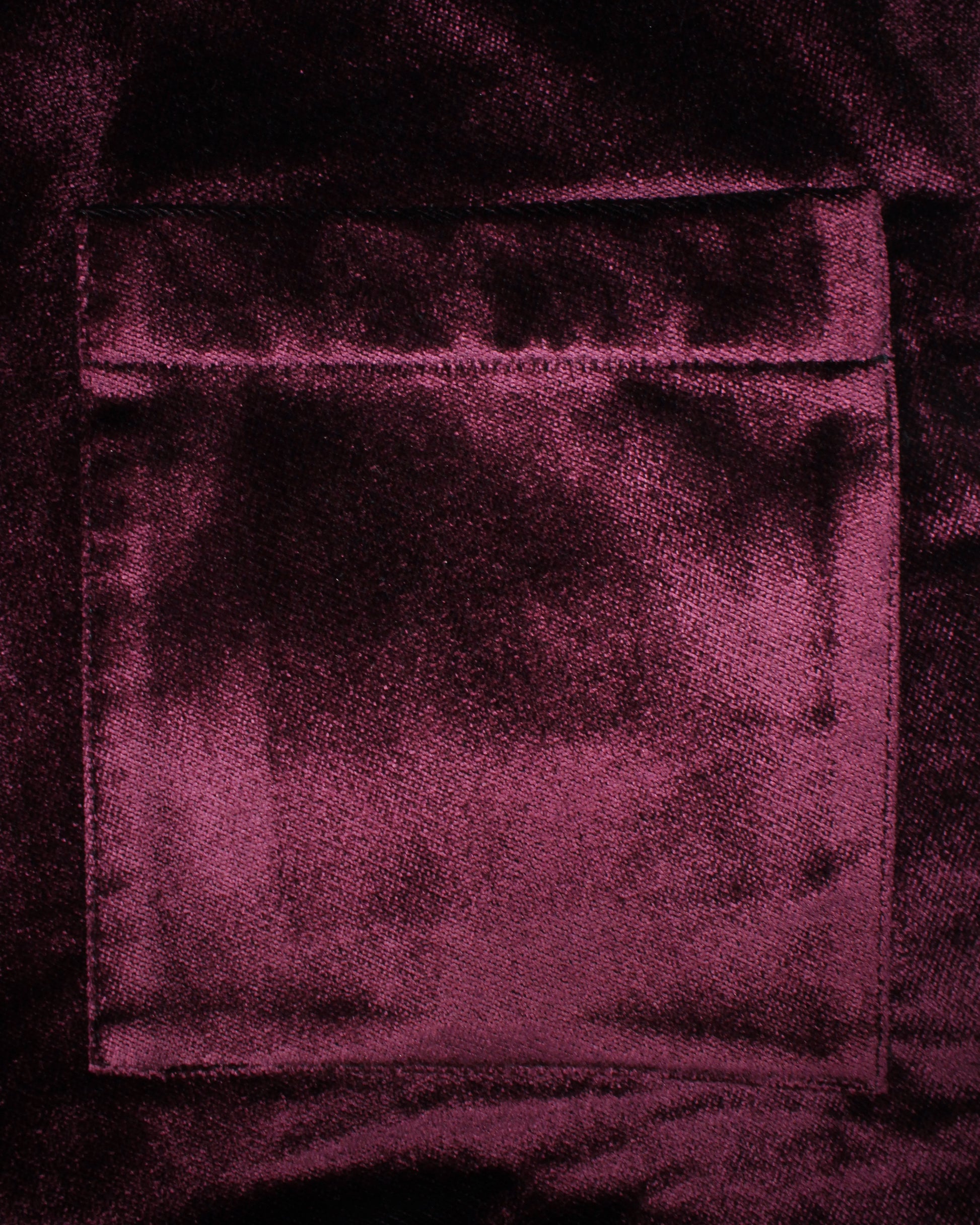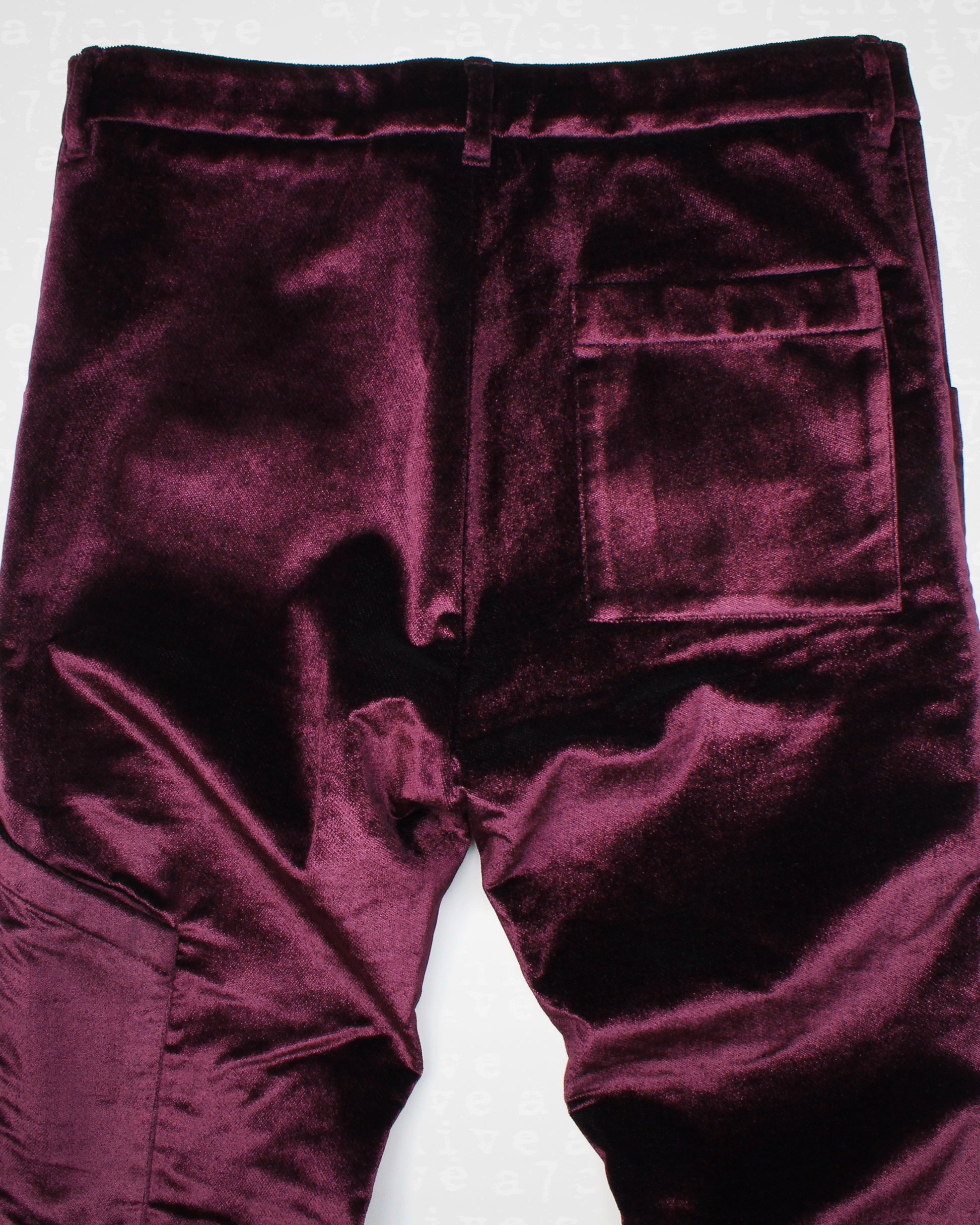 The pants are made from a thick purple velvet and satin viscose lining, and take inspiration from carpenter pants with a side tool pocket and hammer loop